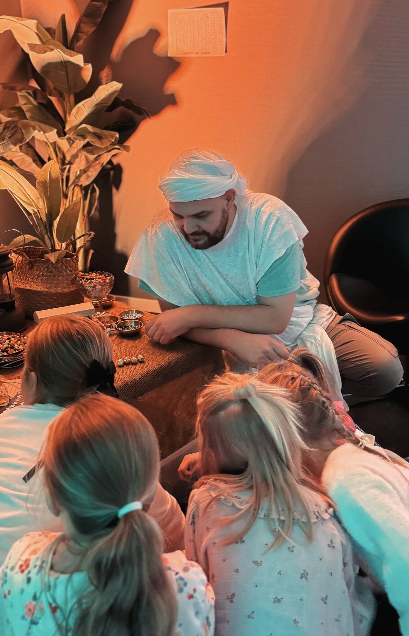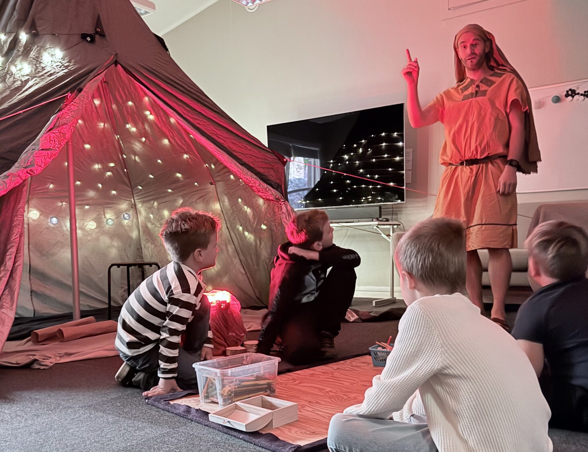 Etter maten måtte barna gjennom tidsmaskinen som skulle ta dem med på en reise – både fysisk og visuelt. Gjennom aktiviteter og fortellinger ble barna kjent med sentrale skikkelser fra Bibelen.